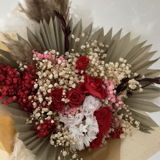 Elegant, hand-tied dried bouquet with a sumptuous palm feel. Natural earth tones meet deep red and creamy white for a luxurious expression that lasts for years - completely without water. A timeless arrangement for the living room, hallway or as a gift.