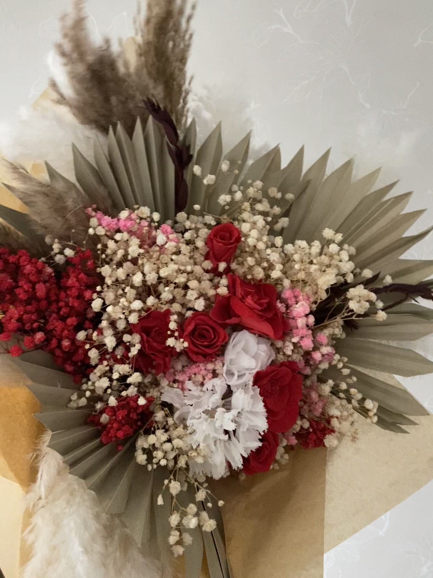 • pampas grass, palm leaves, red roses