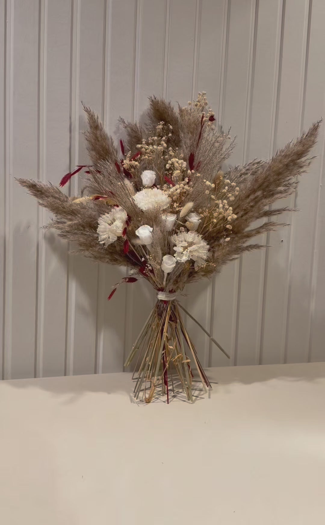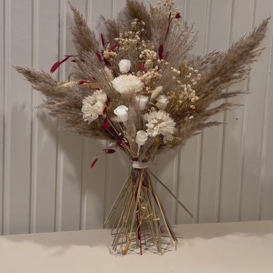A warm and earthy bouquet with a natural character. TERRA combines dried plants in beige, brown and white tones - such as pampas, gyps, and white carnation - in a balanced composition.